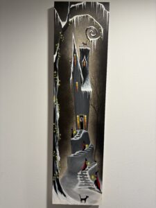 Acrylic paints on (Elongated WOOD 23″ x 6″ Panel) Sides are identical shaped to a stretched canvas but made of wood. Very cool!!